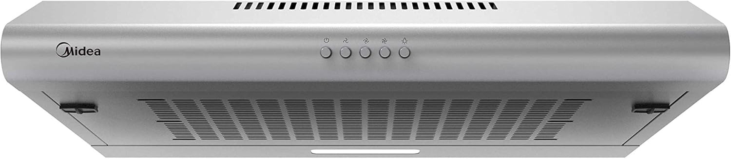 Midea 60F15 conventional re-Circullating hood has stainless steel body and is 60 cm in width. It has 3 speed modes, push button, 2x28W halogen lights and comes with charcoal filter. Its motor power is 125W and has 200M3/H air flow. Compatibility 220-240V/ 50-60Hz.